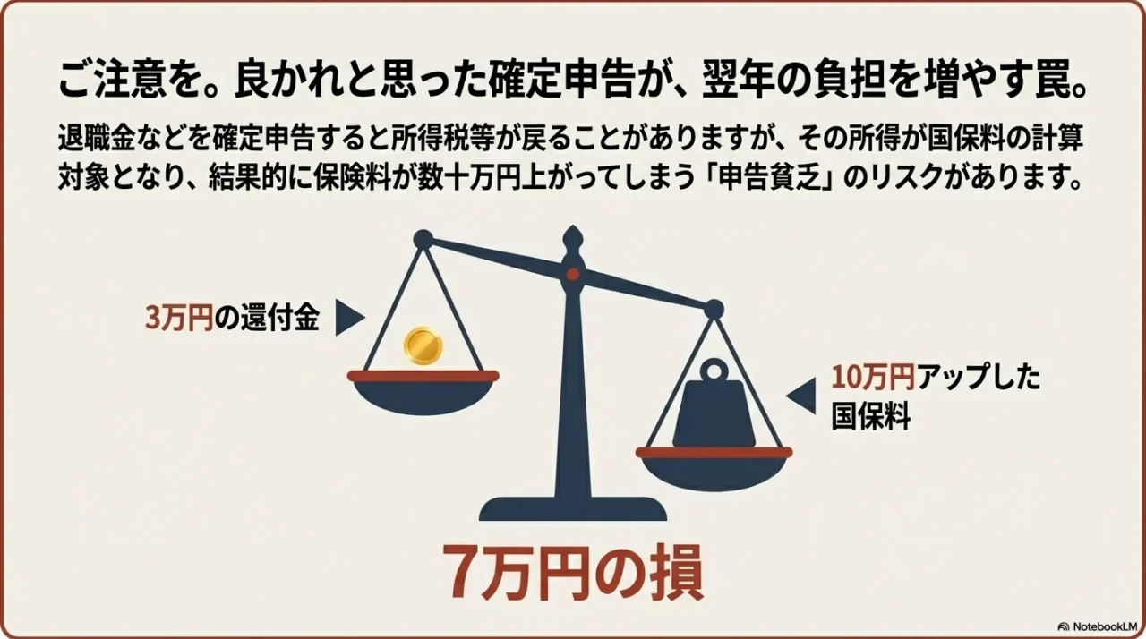 特に退職所得は金額が大きくなりやすいため、うかつに申告すると国保料への影響が甚大です。