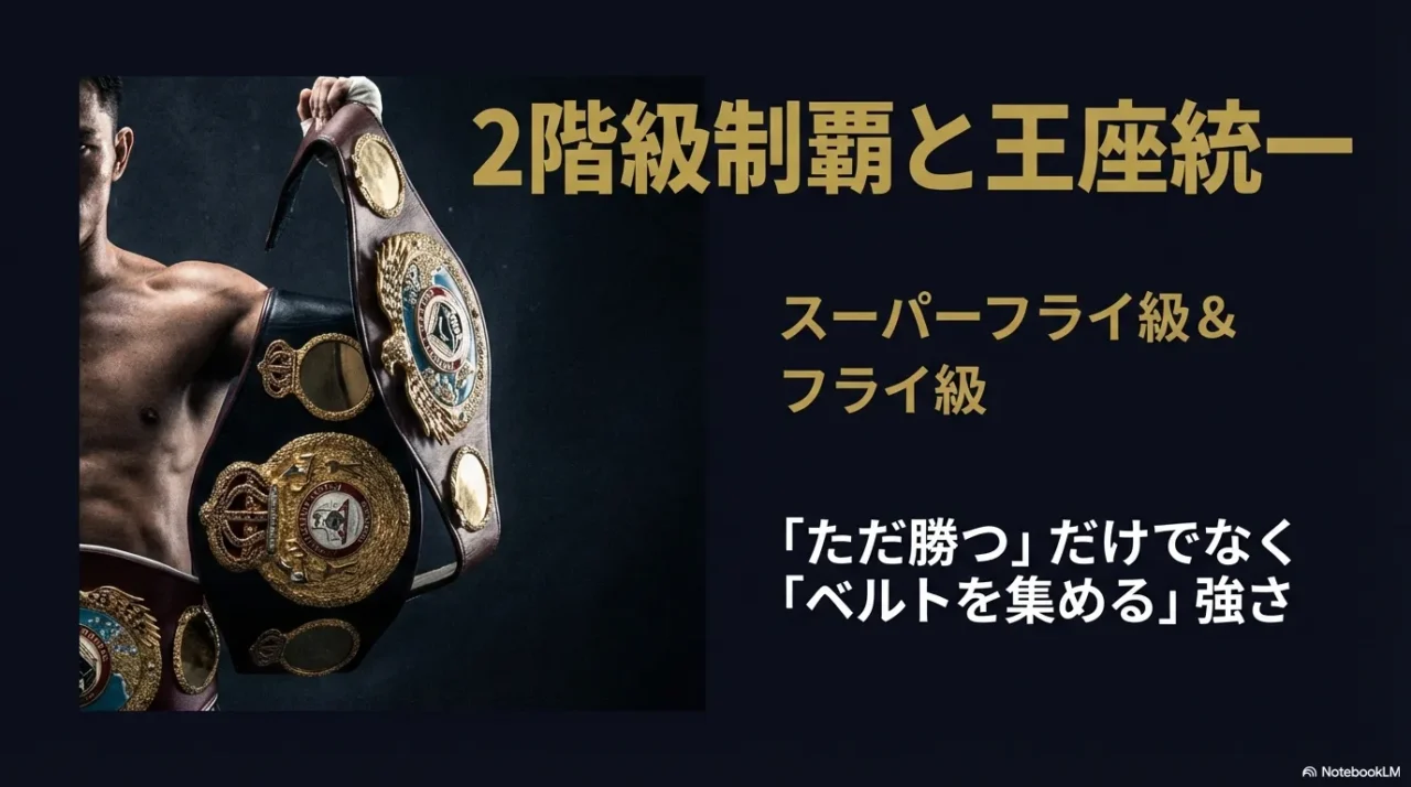 - [03:31] 2階級の支配 スーパーフライ級とフライ級を行き来し、両方で王座を獲得する適応能力の高さ。
