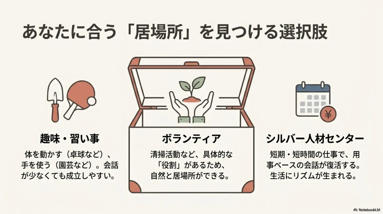 この記事では、公民館サークルやサークル参加、習い事や趣味仲間、ボランティア参加や地域活動参加、生涯学習や学び直し、シルバー人材センターで仕事をして定年後に働く選択肢まで、なるべくお金をかけずに居場所を作る現実的な道筋をまとめます。